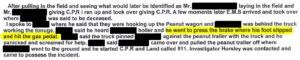 We made some progress, however. After a series of phone calls and knocking on some doors, we were able to reach one person who had been in the field that day. He was willing to sit down with us, so in the yard in front of his house, we interviewed him and prepared a witness statement. He said he had not seen the accident because he was facing the other way at the time, but he did confirm the accuracy of our transcript of his call with the 911 operator, in which he had said that the decedent was “pinned between a peanut wagon and” a pickup truck. He also confirmed that the decedent was alive for a period after the accident (which shows pain and suffering). Click here for a copy of the witness statement.