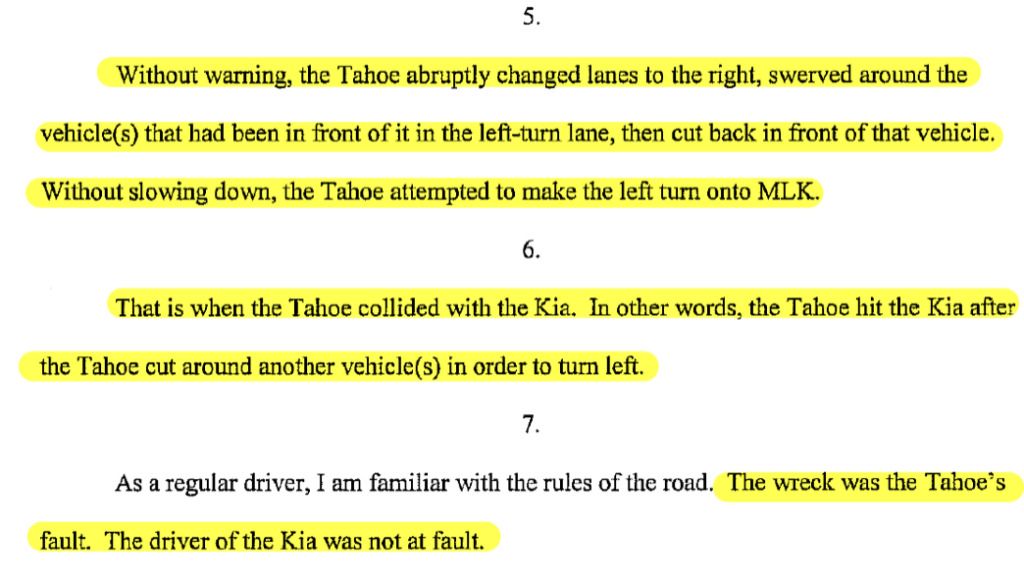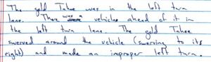 First, we called the only uninvolved eyewitness that had been listed in the police report. We left a message and called again. And again. And sent letters. And knocked on her door. Finally, on our second trip to her apartment, we got to talk to the witness. “Witness 1,” as we’ll refer to her here, did not want to be involved in our case. But she agreed to hear us out, and we explained that our client was a 19-year-old kid who was paralyzed from the waist down who really needed someone to tell the truth. She said she’d talk to us for ten minutes. Then she told us something really important – she said that the Tahoe had not been going straight through the intersection after all, but instead the Tahoe had been turning left, as shown in red in the diagram above. Not only that, she said that the Tahoe had been trying to turn left but was behind a slower-moving car, so the Tahoe swerved to the right around that car, and then cut back to the left to make a reckless turn in front of the Sportage. This was big news. We immediately obtained a written witness statement from Witness 1. Here is a link to that witness statement, with the most important parts shown in the excerpt below.