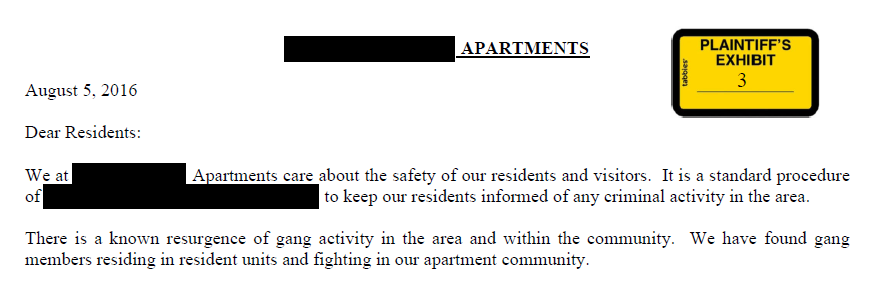 The apartment’s liability was clear. The apartment was in a high-crime area. Evidence showed that the owners knew about multiple shootings and hundreds of other violent crimes that predated our case. Even worse, the evidence showed the owners knew that criminal gang activity plagued the apartment. In a letter addressed to residents, the owners wrote that “[t]here is a known resurgence of gang activity in the area and within the community.” Another written communication identified several residents believed to be gang members.