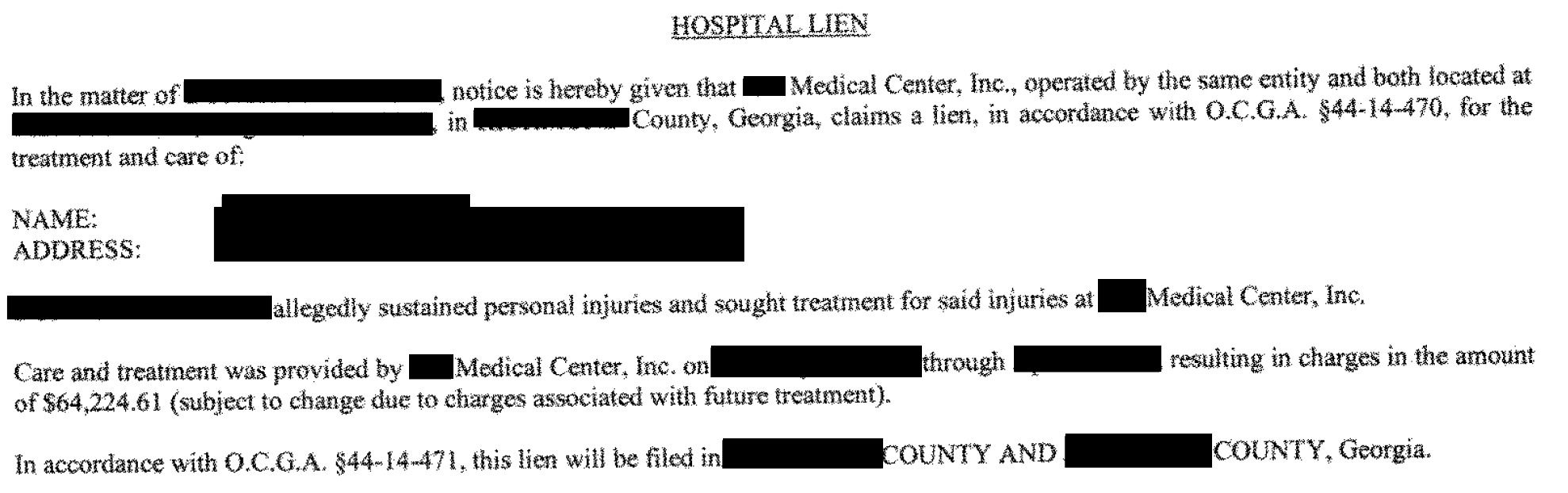 In Georgia, hospitals can file liens for medical treatment they do when the patient is hurt as a result of someone else’s negligence. See O.C.G.A. § 44-14-470. These liens are filed in the county where the hospital is located and can also be filed in the county where the patient lives. If a hospital properly files a lien, then the patient will be required to pay back the hospital from any settlement funds they receive. But these liens can be challenged or reduced.