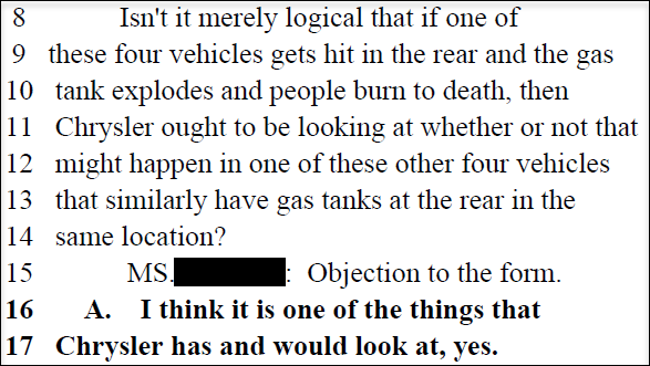 - FCA’s Chairman and CEO admitted that if one of these rear-tank Jeeps exploded in rear impact, FCA “has and would look at” the other Jeeps with rear-mounted gas tanks. Marchionne Dep. 43:08-17.