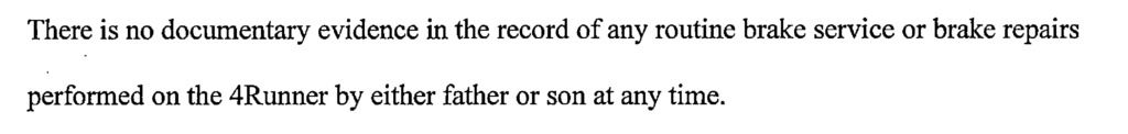 The evidence in the case showed that there were no problems with the brakes before the wreck and there were no problems after the wreck. Neither defendant was able to show any brake maintenance before the wreck. Further, neither defendant repaired the 4Runner’s brakes after the wreck before they sold the car to another driver.
