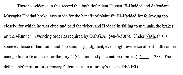 As to the claim for attorney’s fees, the Court found that both defendants violated a statute that was enacted for the protection of motorists. Mr. Abdallah violated the law prohibiting drivers from “following too closely” and Mr. Abdallah’s father violated the law requiring drivers to keep their brakes in “good working order.” The Court found that both of those violations were evidence that each defendant acted in “bad faith,” which allows the plaintiff to seek attorney’s fees.