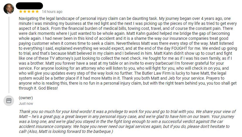 The case was handled at BLF by Matt Kahn, Jeb Butler, and Melody Walker. Our client’s Google review of us is below. His video review of us is above – it’s the first video on this page.