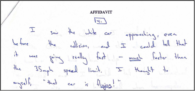 We knew we faced an uphill battle from the beginning of this case because the police report Mr. Goss as the at-fault party in the collision. We moved quickly to gather important evidence, including the surveillance footage that showed the white sedan speeding and colliding with Mr. Goss. Attorney Jeb Butler also met with several witnesses, one of whom testified by affidavit that the driver of the white sedan was “flying” as she approached the Circle K.
